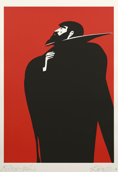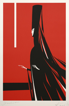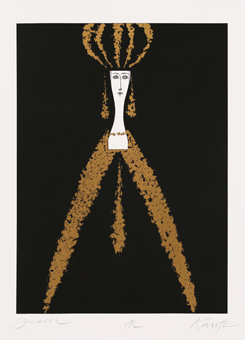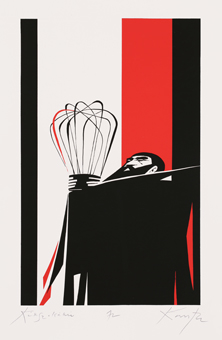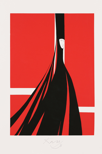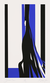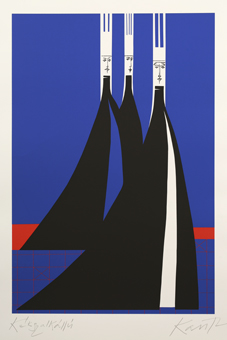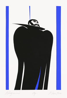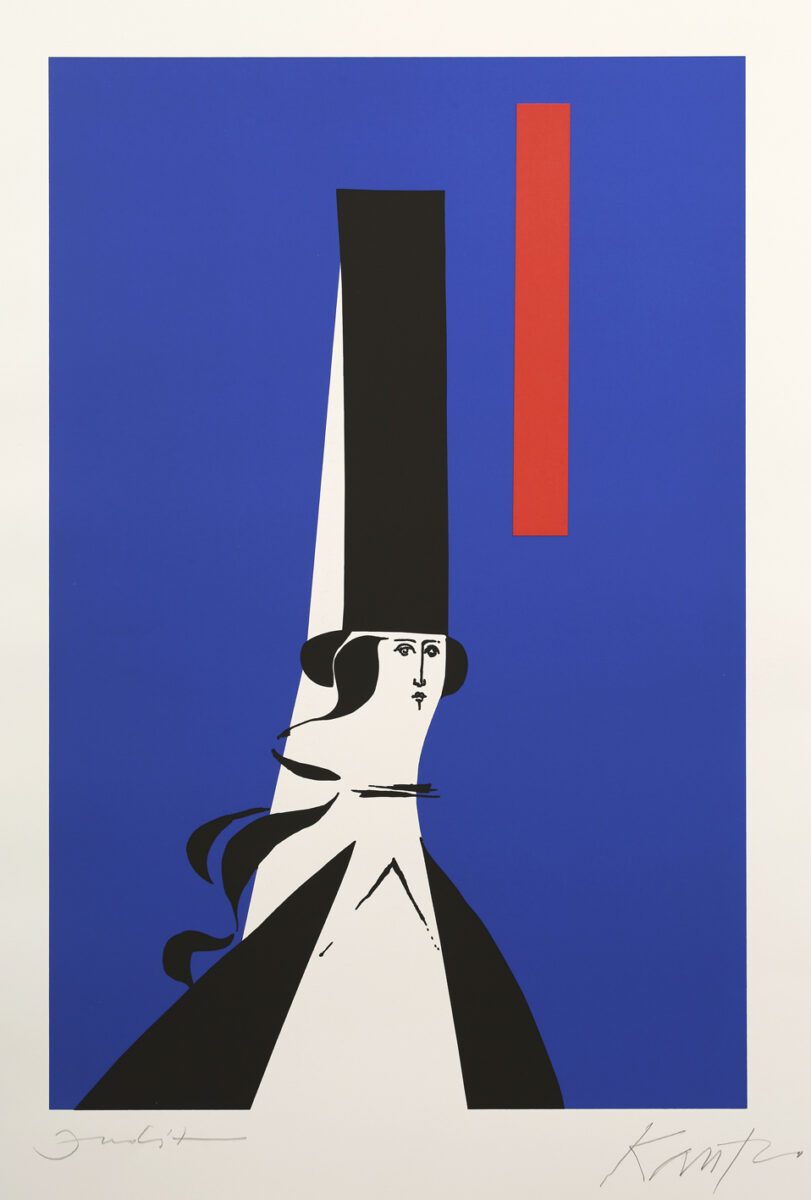János Kass first created illustrations for the work in 1960 at the request of the Helikon Publishing House, and later returned to the theme several times. The artist said of Bluebeard the following: „It is the eternal duel of two opposites, black and white, positive and negative. The conflict arising from the fundamental difference between man and woman is fate.” This eternal opposition is effectively expressed by the artist’s use of contrasting colours that convey strong emotions: the blue-red and black-white colour pairs. Finally, the golden colour is the climax, which sinks into the blackness of the background, radiating hopelessness. The minimalism of the forms makes the effect created by the colours even more powerful.